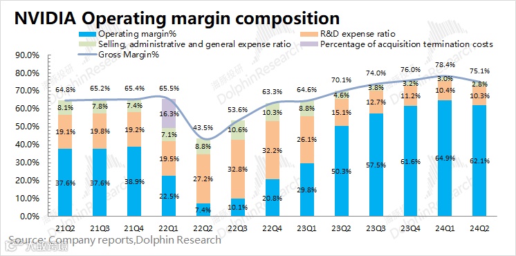 2025财年第二季度英伟达营业利润率为62.1%,有所下滑。本季度营业利润率的下滑,主要是受毛利率下降的影响。