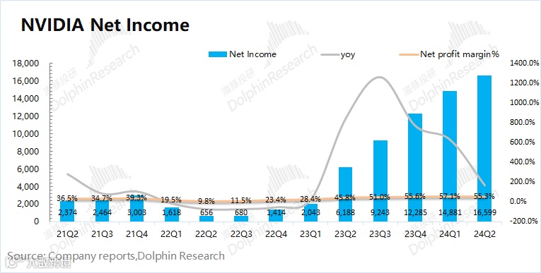 2025财年第二季度英伟达净利润166亿美元,同比大幅增长。本季度净利率为55.3%,环比有所下滑。本季度公司虽然收入端仍在增长,经营费用率继续下滑,但毛利率下降幅度更大,带动净利率的环比下滑。