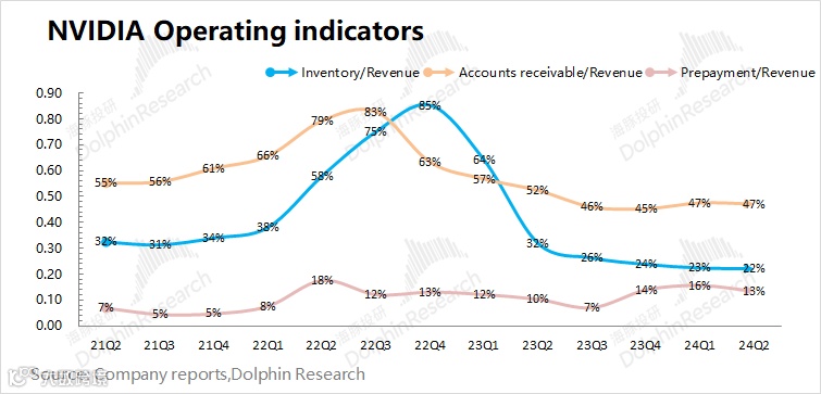 3、主要财务指标:费用率维持在低位。英伟达本季度经营费用率继续下滑至13.1%,收入的增速抵消了费用端的增加。存货端当前占比仍然处于历史低位,这也表明公司当前产品的需求情况还是不错的。