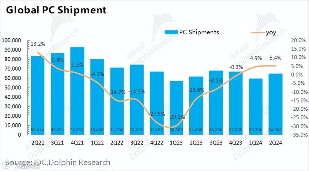 PC整体市场出货量好转,也是公司游戏业务增长的因素之一。根据IDC最新的数据,2024年二季度全球PC市场出货为6490万台,同比增长5.4%。随着整体市场的回暖,PC市场已经有一定的修复,英特尔和AMD的PC业务也有所回升。由于游戏显卡主要搭载于PC上,英伟达的游戏业务也有一定的受益。