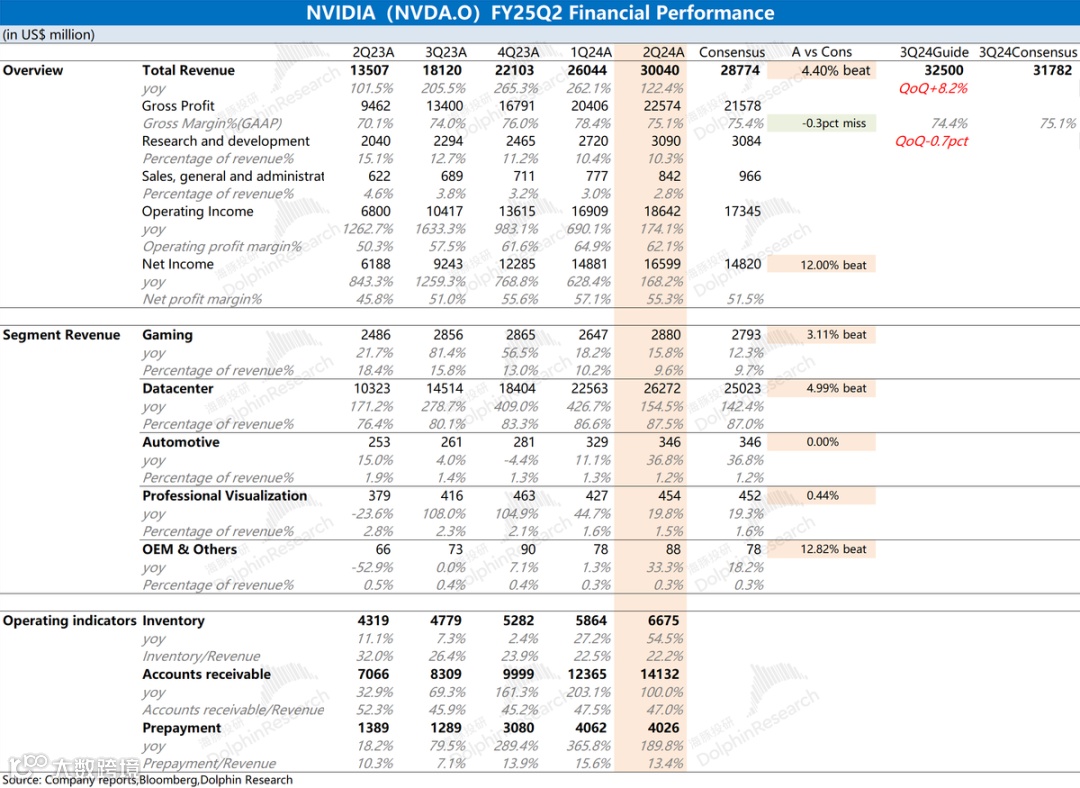 1、整体业绩:收入增速放缓,毛利率有所下滑。本季度英伟达公司实现营收300.4亿美元,同比增长122.4%,略好于市场预期(288亿美元)。本季度英伟达实现毛利率(GAAP)75.1%,低于市场预期(75.4%)。受材料存货储备等负面影响,毛利率有所下滑。而本次财报的净利润166亿美元,同比上升168%。利润端再创新高,但增速有所回落。
