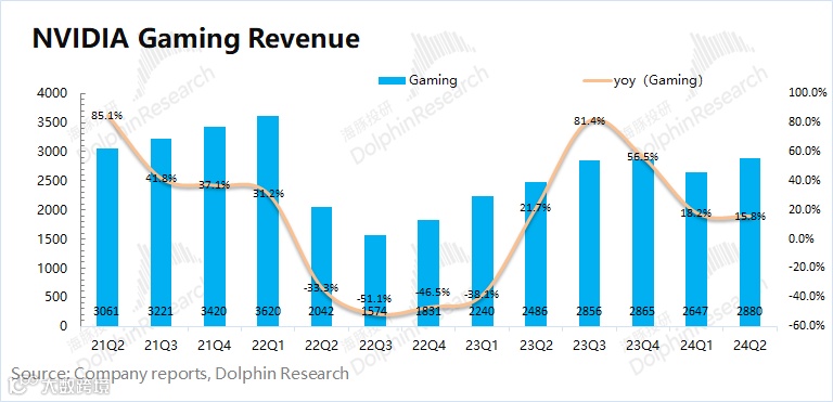 2.2游戏业务:2025财年第二季度英伟达游戏业务实现营收28.8亿美元,同比增长15.8%。主要得益于GeForce RTX 40系列GPU 和游戏机SOC的销量增加。。