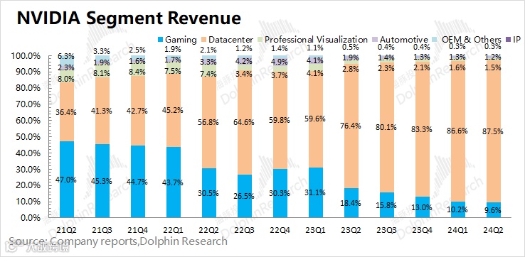 在AI等需求的带动下,2025财年第二季度英伟达数据中心业务在公司收入中的份额继续扩大,本季度达到了87.5%。游戏业务的占比被挤压至一成以下,数据中心业务是影响公司业绩最重要的一项。