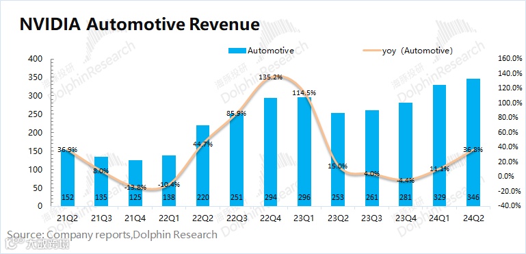 2.3 汽车业务:2025财年第二季度英伟达汽车业务实现营收3.46亿美元,同比增长36.8%,英伟达的汽车业务,主要来自于AI Cockpit 解决方案和自动驾驶平台推动的。
