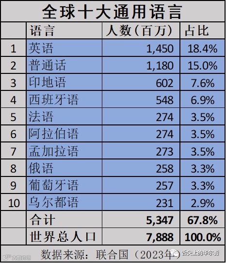 全球第一大语言是什么?很多人想当然认为是普通话。毕竟,中国有14.1亿人,占78.88亿全球总人口的17.9%呀。不过,这不是正确的答案。