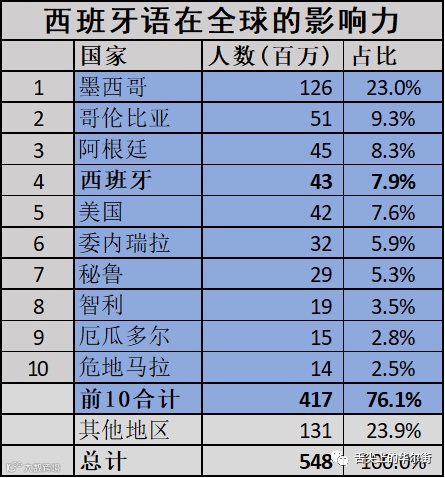 西班牙本地仅占西语人口的7.9%,美洲合计则接近80%。墨西哥是第一大西语国家,而美国则有约6257万拉美裔移民,占人口总数的19%。其中,约2/3的拉美裔依旧以西班牙语为母语。