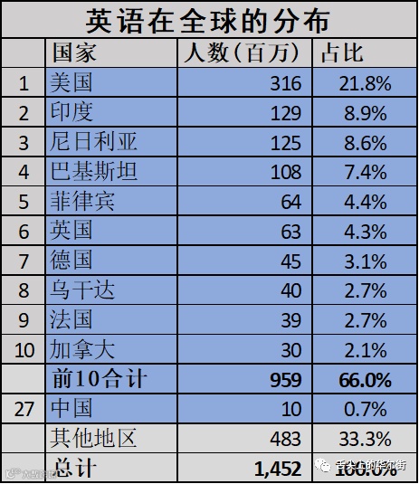 英语在全球的分布极广,使用人数遍布190多个国家和地区。前十大国家合计有9.6亿讲英语人群,在全球英语人口占比66%。以英语为母语的澳大利亚和新西兰,因为本国人口较少,甚至排不上全球的前十。
