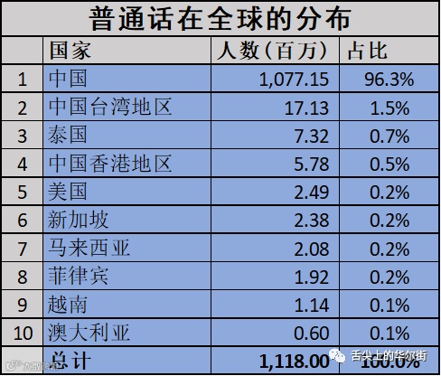 尽管全球有11亿人讲普通话,但是高达96.3%都在中国大陆。如果加上中国台湾,香港、澳门和新加坡等以华语为官方语言的地区,则占比接近99%。