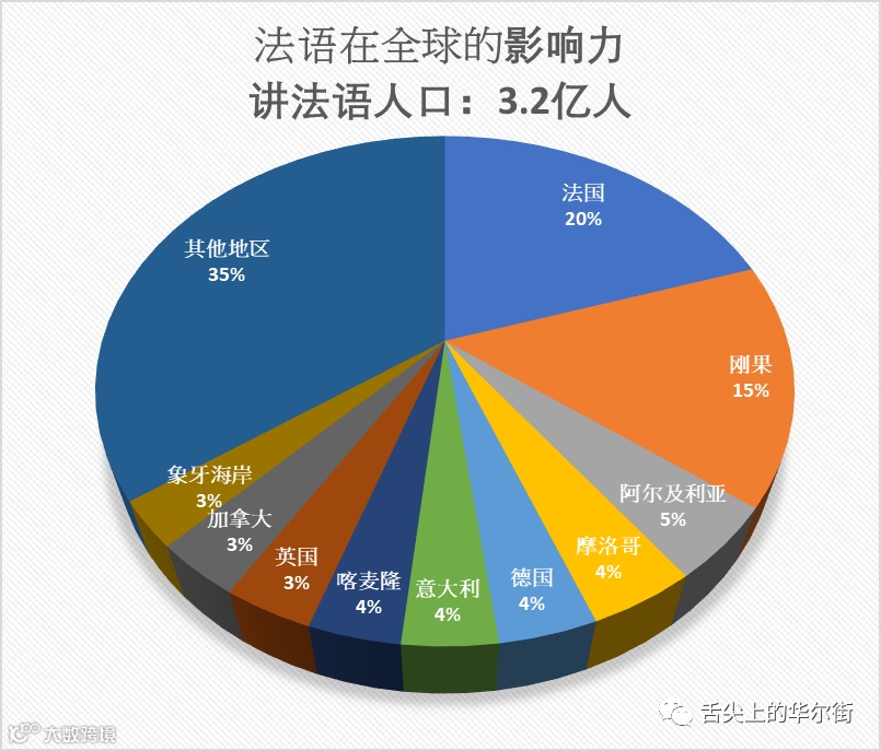 法国有6496万人口,占全球法语人群的20%。与海洋霸权英国和西班牙相比,欧陆霸主法国的殖民地主要在非洲。上世纪殖民地纷纷独立后,它们依旧有大量讲法语的人群。