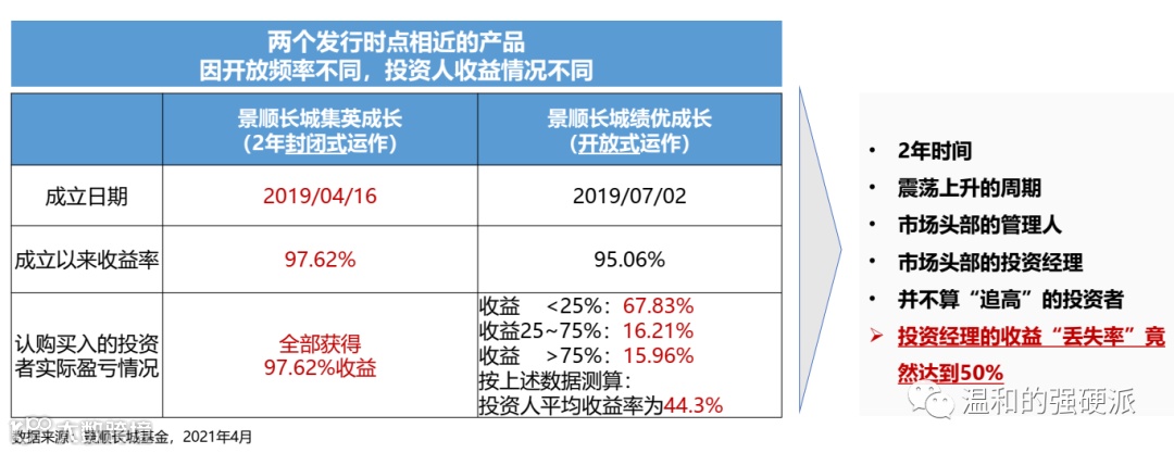 同样的明星基金经理、同样的投资策略、同样的牛市中前期、同样的震荡上升行情,但到2021年两年的封闭期结束后,两只收益接近的基金,却产生了截然不同的投资效果。
