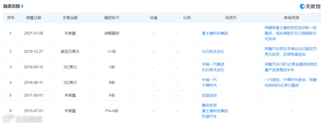 凭借雄厚背景和豪华明星团队,拜腾汽车自然而然吸引了各路资本的目光。据天眼查信息显示,拜腾汽车共完成6轮融资,投资团队整容强大,其中不乏富士康、一汽集团、宁德时代、腾讯投资、丸红株式会社等明星机构,总融资金额高达84亿元。