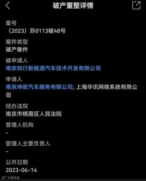 无独有偶,赶在同一天,拜腾汽车的另一家关联公司南京知行电动汽车有限公司(简称“知行电动车”)也新增一则破产案件,申请人为南京市栖霞区电力设备安装工程有限公司、圣戈班汽车玻璃(上海)有限公司、上海华讯网络系统有限公司,经办法院同为南京市栖霞区人民法院。
