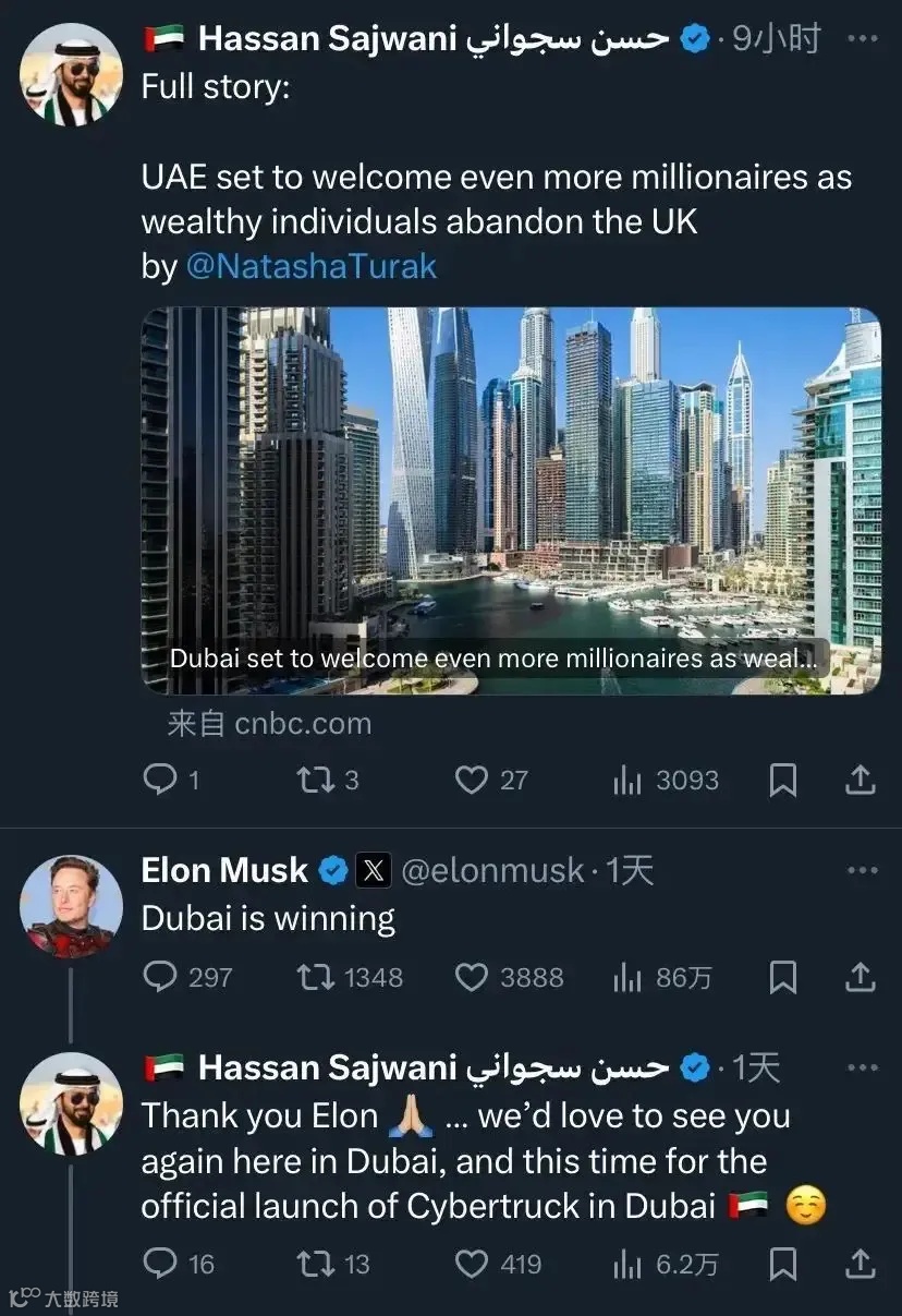 宽松的金融政策和极具吸引力的税收优惠,迅速吸引了全球资本与人才的流入。根据最新的数据显示,2024年预计将有6700位百万富翁移居阿联酋,主要集中在迪拜,远超第二名美国、第三名新加坡。“马斯克更是盛赞迪拜赢定了!”