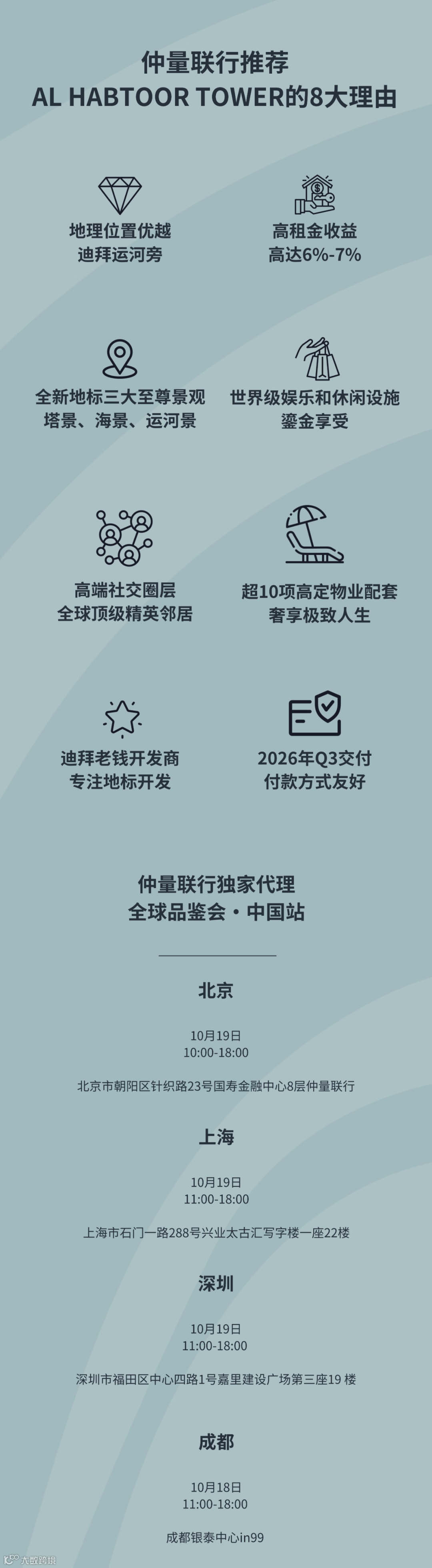 金秋10月,全球知名地产投资机构仲量联行将于北京、上海、深圳、成都为投资者呈现前所未有的财富增长机遇!无论您是寻找高回报的投资项目,还是想在世界顶级城市拥有一处属于自己的不动产,迪拜都是您的首选。我们将在活动中为您带来2024年不可错过的迪拜市中心商业港地标项目——AL HABTOOR TOWER,该项目位于迪拜核心区域,预计于2026年第三季度交付,起价仅210万迪拉姆。租金收益率高达6%-7%,是您实现投资回报的绝佳选择。