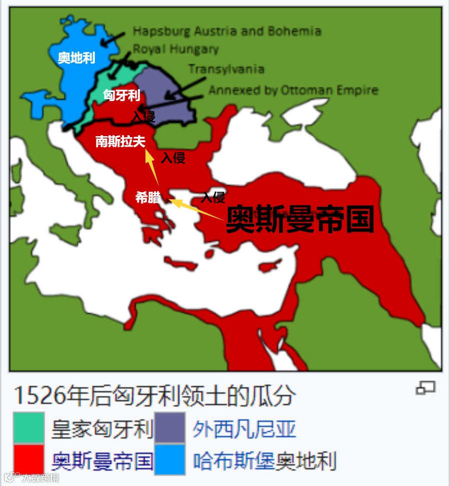 ▲匈牙利战败后,被奥斯曼帝国和哈布斯堡王朝(奥地利)瓜分