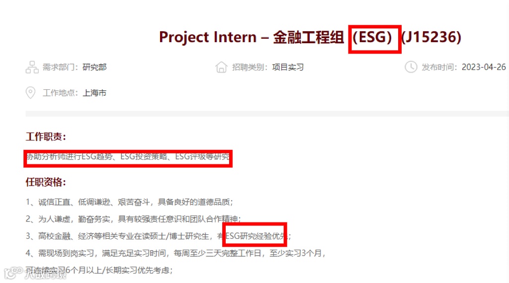 今年4月,中金公司金融工程组公开招聘ESG项目实习生,协助分析师进行ESG趋势、ESG投资策略、ESG评级等研究,学历要求硕士及以上,有ESG研究经验优先。