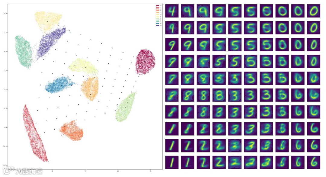 如图3所示,我们用MNIST训练了一个编码解码器,在隐空间画出了数据集的隐空间分布,10个手写体数字对应着10个团簇,每个团簇是一个模式(mode),即数据流形的一个联通分支。团簇的边界就是数据隐空间分布支集的边界。我们在隐空间生成了100个采样点,通过解码生成100个手写体数字图像。如果采样点落在某个团簇内部,则其生成的图像就非常清晰;如果采样点落在团簇边界的外部,则其生成的图像就非常模糊,往往是两个手写体数字的融合。因此,识别数据流形的边界对于识别临界状态非常重要。