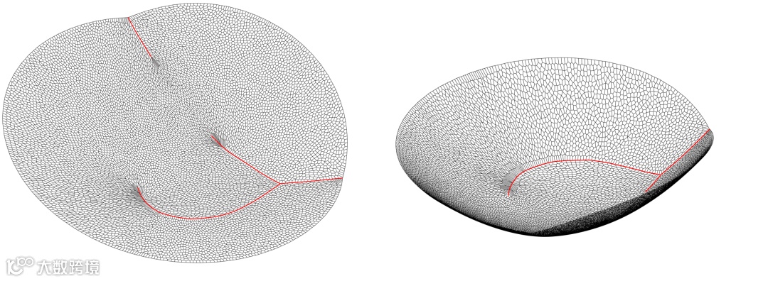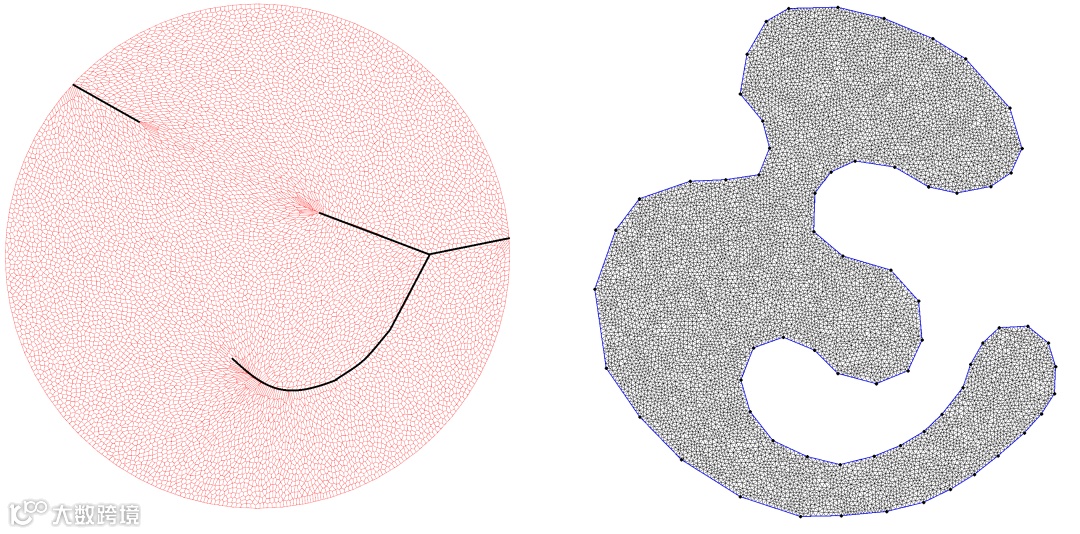 扩散模型的弊端可以被基于几何方法的最优传输模型所克服。如图4所示,假设我们计算从圆盘内部的均匀分布到右侧海马形状区域内的均匀分布的最优传输映射,根据相应的Brenier定理,最优传输映射由某个凸势能函数的梯度映射给出。这一势能函数满足蒙日-安培方程,势能函数并非处处可导,其连续、非可导的集合投影到圆盘区域的奇异集合(黑色曲线),规则点映射到目标区域的规则点,奇异集合映射到目标区域的边界(每个奇异点同时映射到左右两个边界点)。当我们跨越奇异集合的时候,就意味着我们跨越了两个稳衡态,必然有临界(灾变)事件发生,即稳恒态被打破的物理事件。由此可见,精确找到传输映射的奇异集合,探测临界(灾变)状态,对于物理世界建模具有根本的重要性。