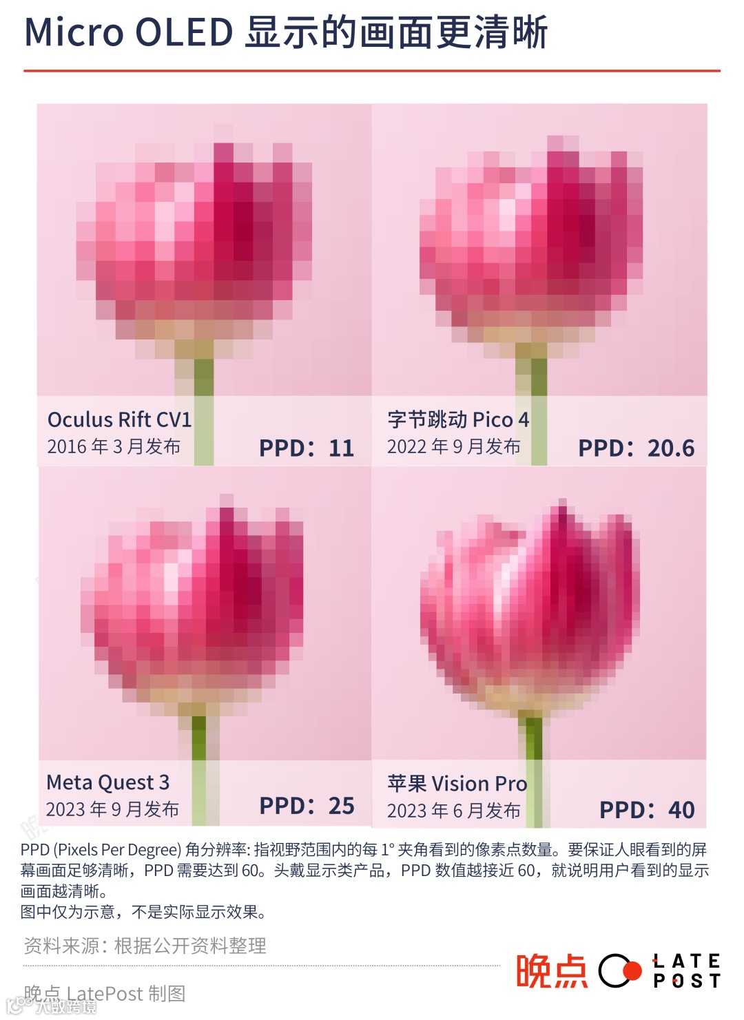 最好的手机、电脑或电视的屏幕贴在眼前,1° 范围内只能看到几个像素。去年 9 月发布的 Quest 3 用了特制的 Fast-LCD 屏幕,把PPD做到了 25,画质依然不够好。而索尼造的 Micro OLED 能把这个数字做到 40 左右。