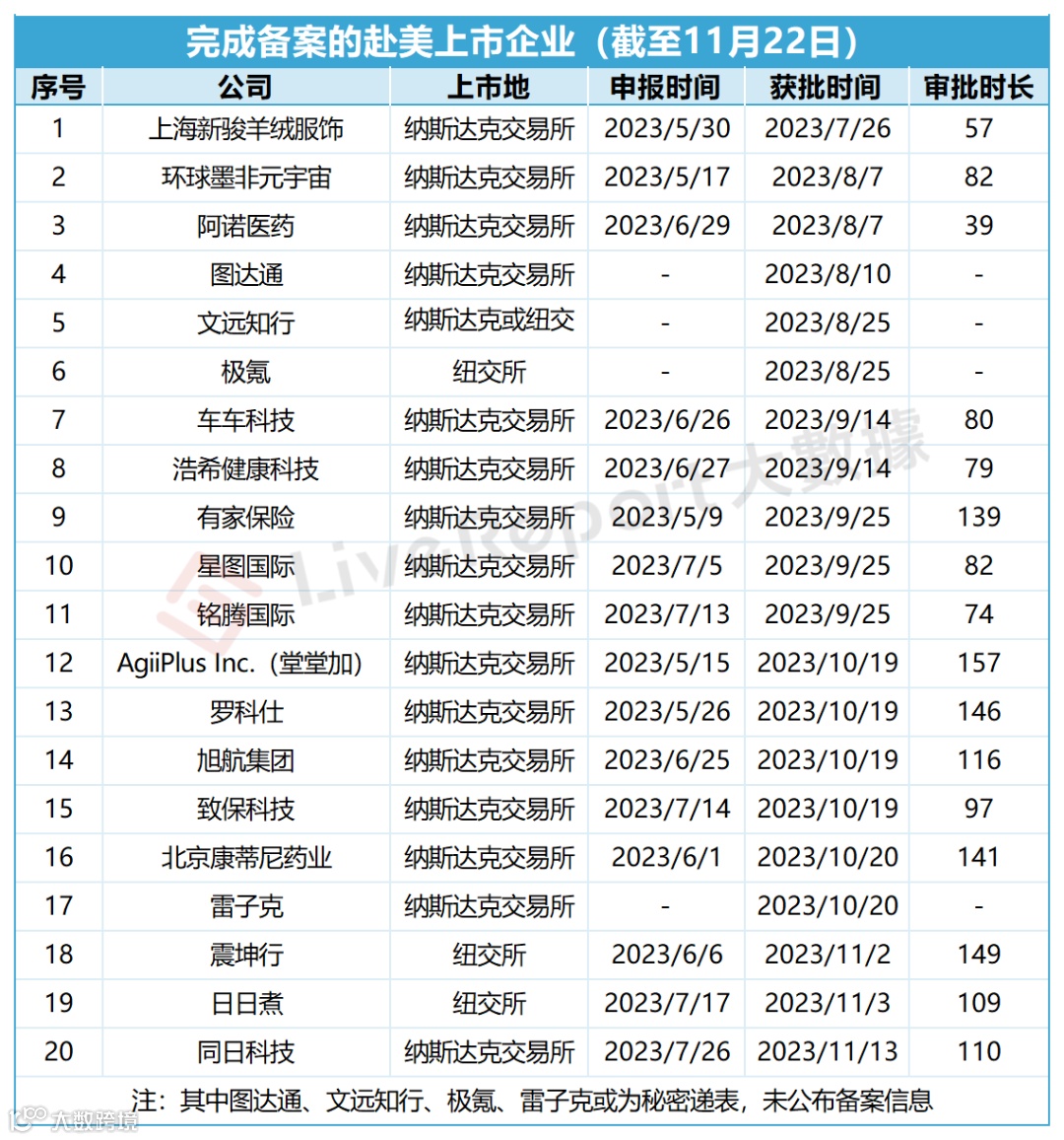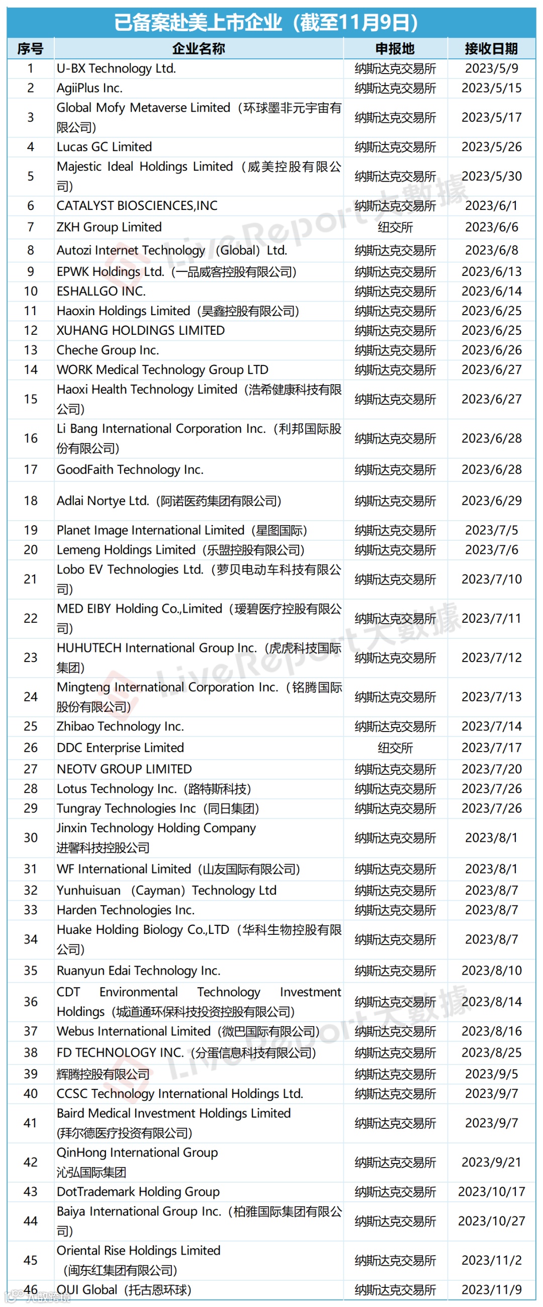 据LiveReport大数据统计,已在中国证监会备案的拟赴美上市的企业共50家(图达通、文远知行、极氪、雷子克或为秘密递表,未公布备案信息)。其中,拟纳斯达克交易所上市的企业有47家,纽交所有3家(文远知行未公布上市地,暂时归为纳斯达克交易所)。