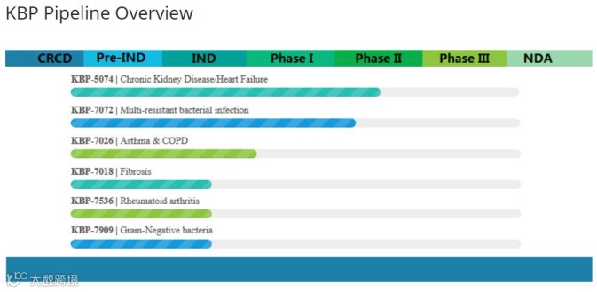 等到黄振华烧完自己的钱想起融资的时候,呈现在沈青面前的是一排漂亮的管线。“坦率说那个时候的管线比现在的管线更好看一点,不是一家single asset company。除了KBP-5074,还有一个进入临床阶段的抗生素品种KBP-7072(这个品种虽然还在管线列表中、但似乎依然停留在当初的进度上),以及多个临床前项目,分布于炎症/自身免疫性疾病、器官保护和细菌感染。当时KBP-5074就已经准备启动临床IIb期,我们已经看到了能够验证分子设计理念的临床IIa期数据。”