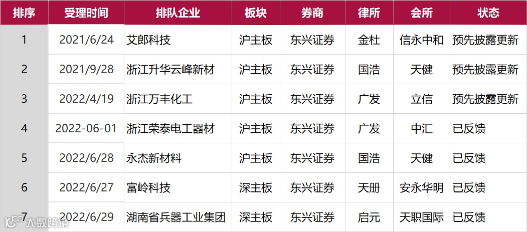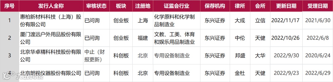 截止2022年11月19日东兴证券共有11个IPO项目在排队,北交所无审核企业,沪主板共5家、深主板2家、创业板2家、科创板2家。