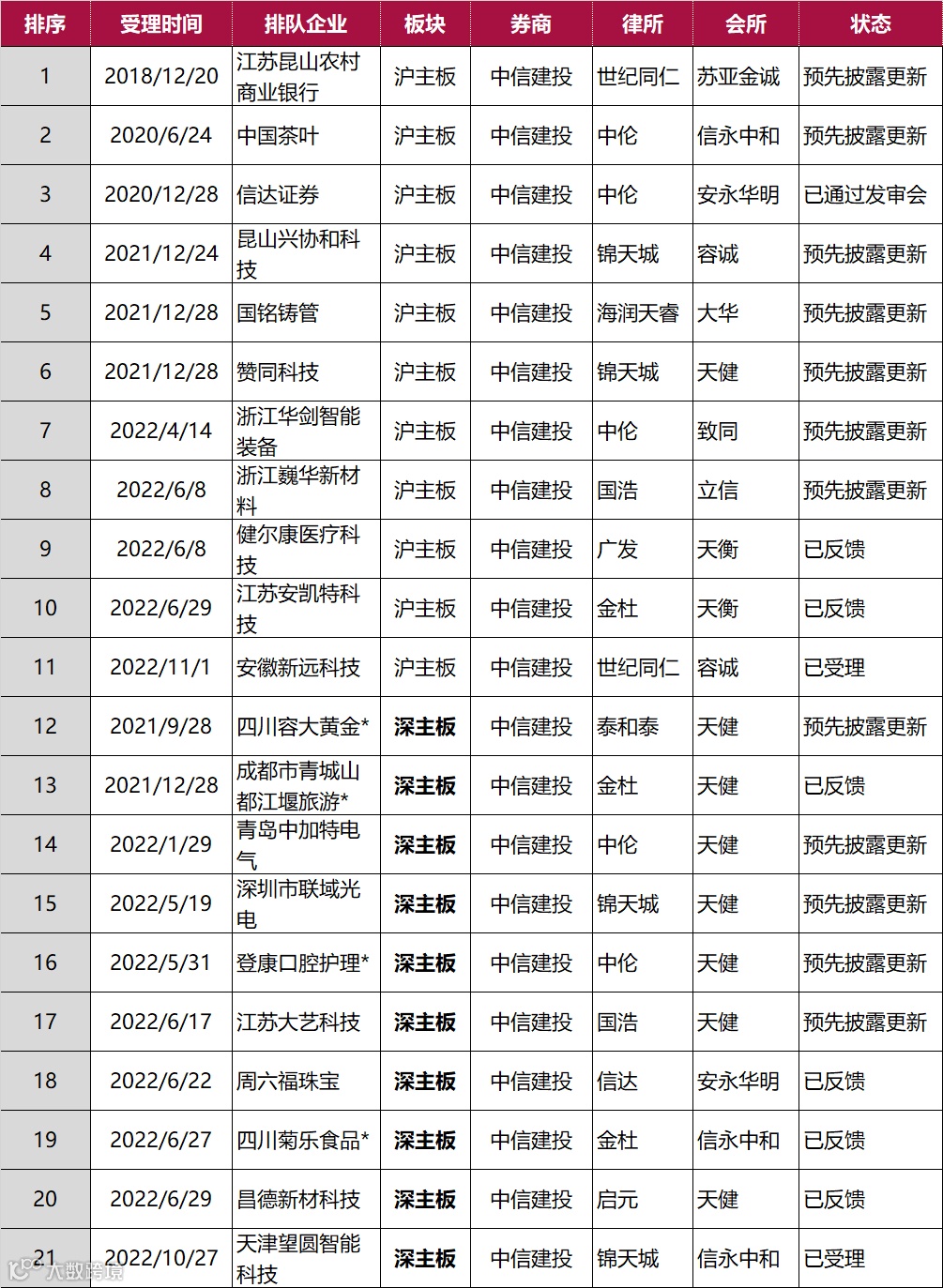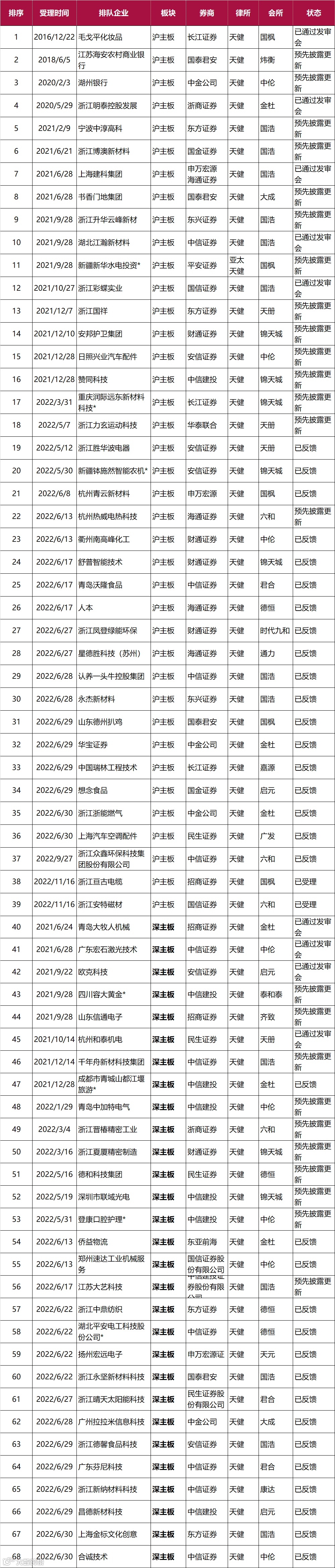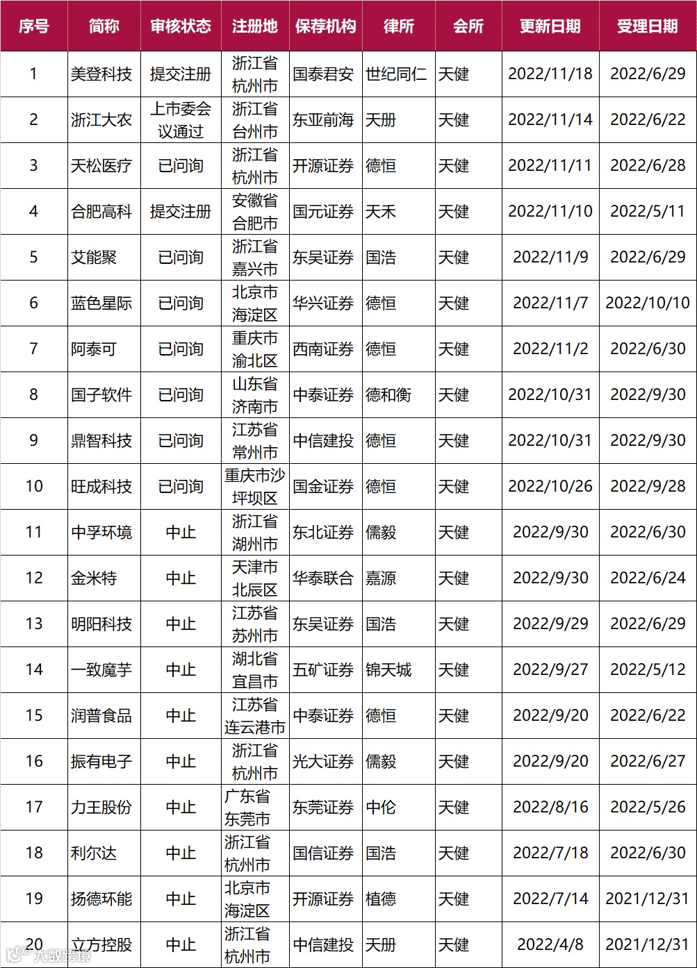 截止2022年11月19日天健共有186个IPO项目在排队,北交所20家、沪主板共39家、深主板29家、创业板65家、科创板33家。