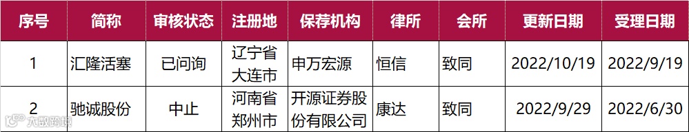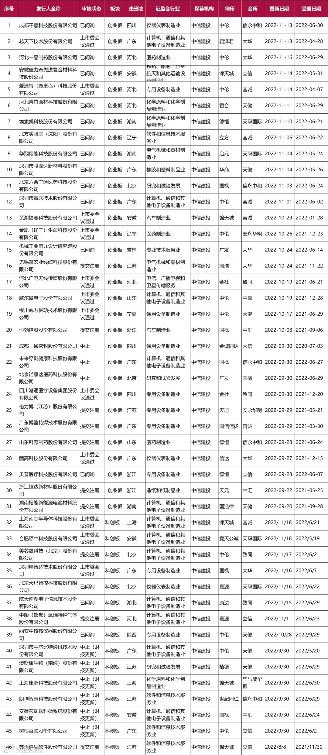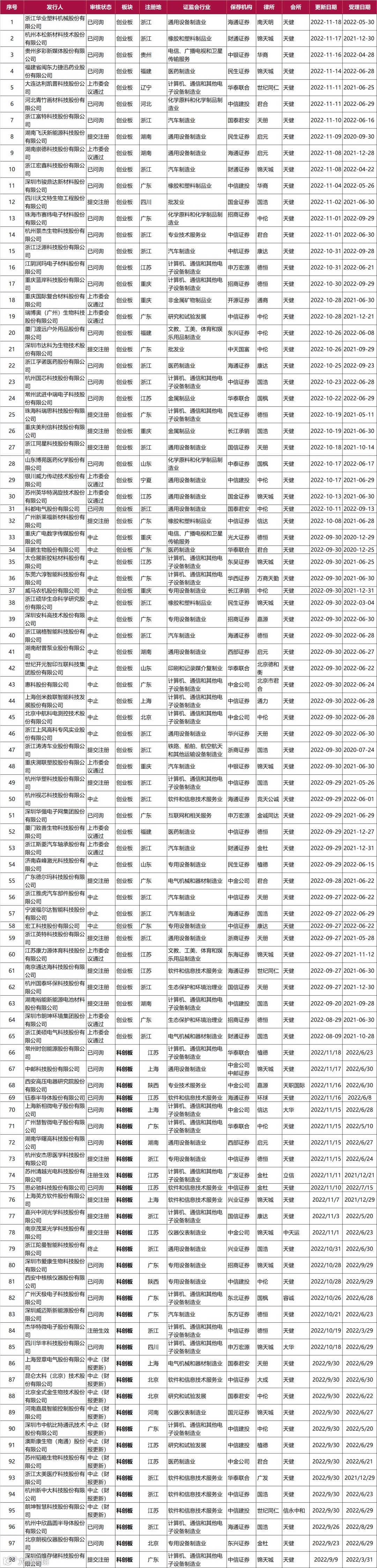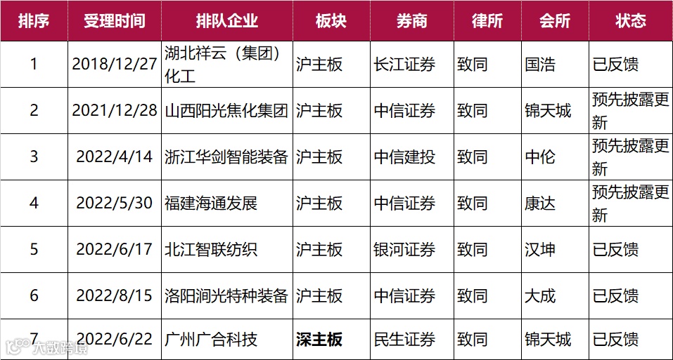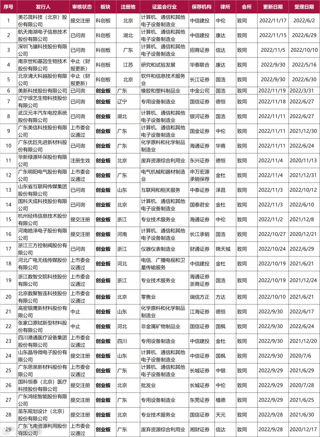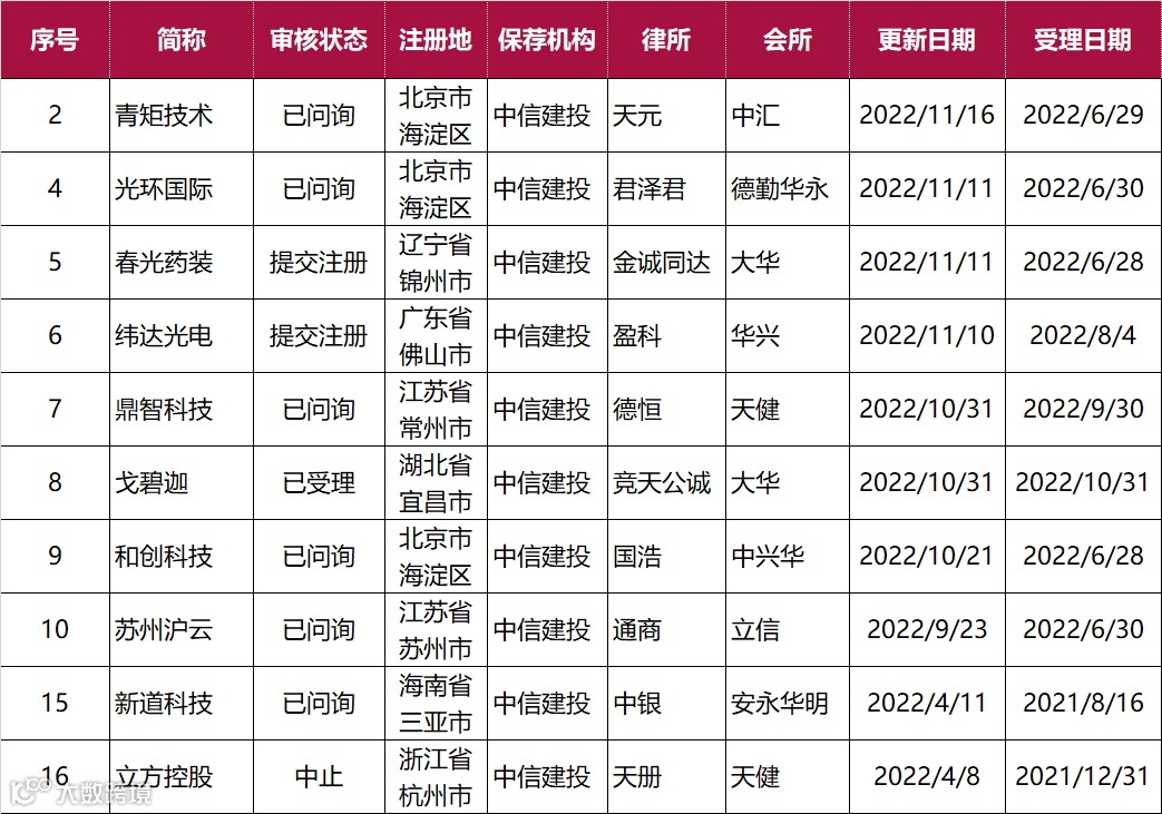 截止2022年11月19日致同共有38个IPO项目在排队,北交所2家、沪主板共6家、深主板1家、创业板24家、科创板5家。