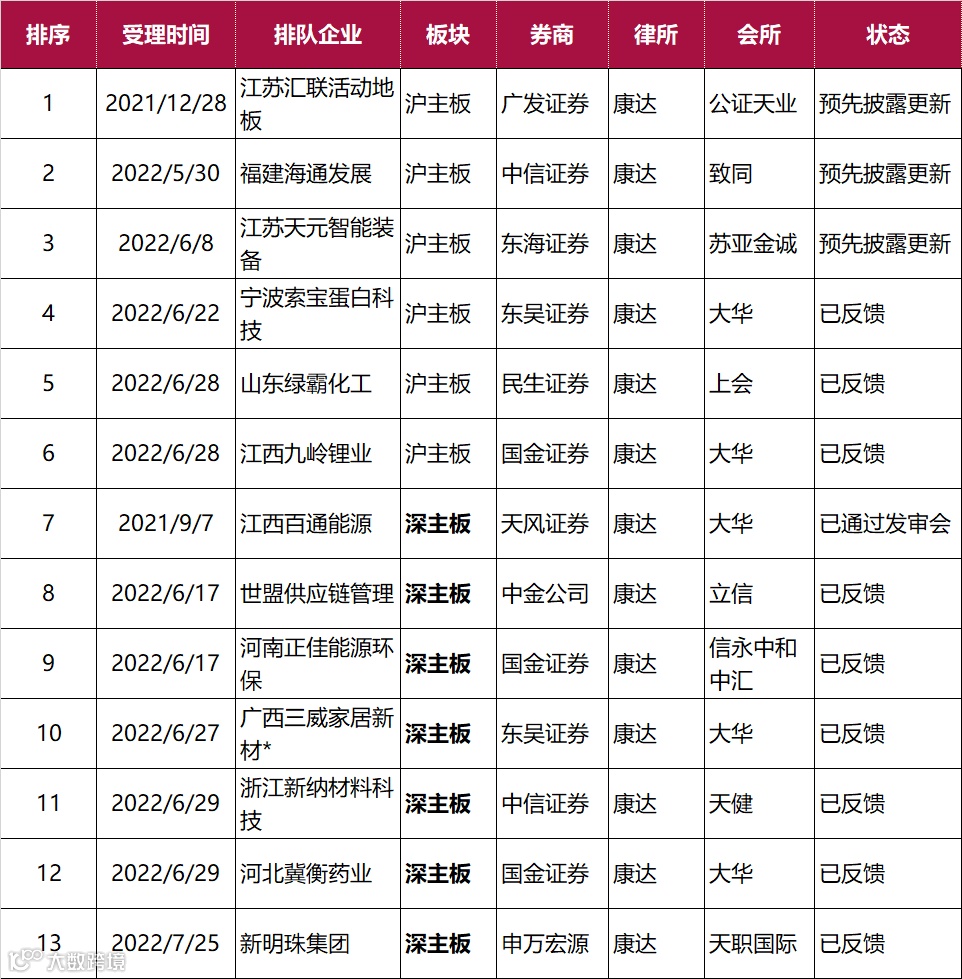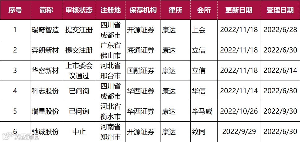 截止2022年11月19日康达共有44个IPO项目在排队,北交所6家、沪主板共6家、深主板7家、创业板18家、科创板7家。