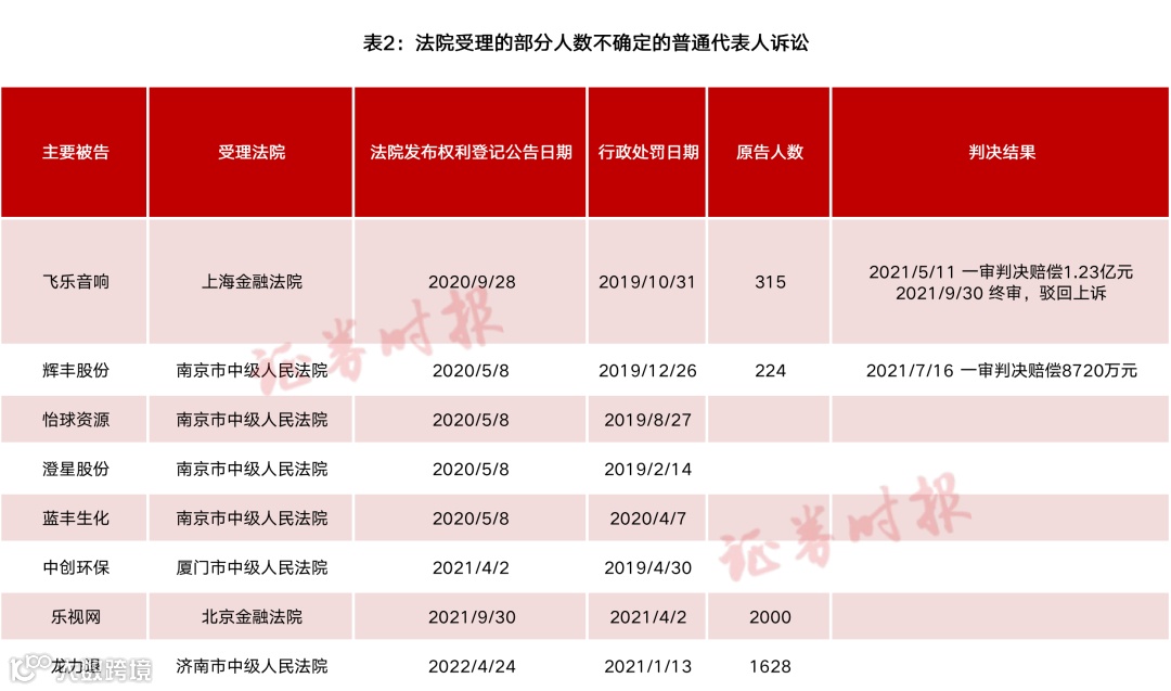 飞乐音响为普通代表人诉讼的全面落地提供了示范。2022年4月济南中院受理的“龙力退”证券虚假陈述责任纠纷普通代表人诉讼,参诉人数多达1628人。北京金融法院受理的乐视网、贾跃亭等证券虚假陈述责任纠纷案代表人诉讼,索赔人数已超过2000人,索赔金额高达46亿元,或将成为中国证券史上投资者索赔第一大案。