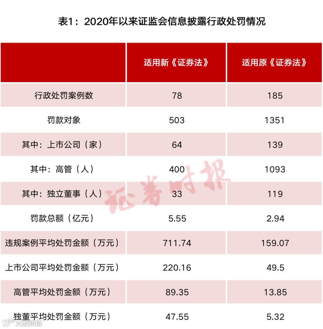 其中,针对上市公司的平均处罚金额为220.16万元,是同期适用原《证券法》处罚的上市公司平均罚金的4.4倍;针对高管层的平均处罚金额为89.35万元,是适用原《证券法》处罚案件平均罚金的6.45倍;针对独立董事的平均处罚金额为47.55万元,是适用原《证券法》处罚案件平均罚金的8.94倍(表1)。