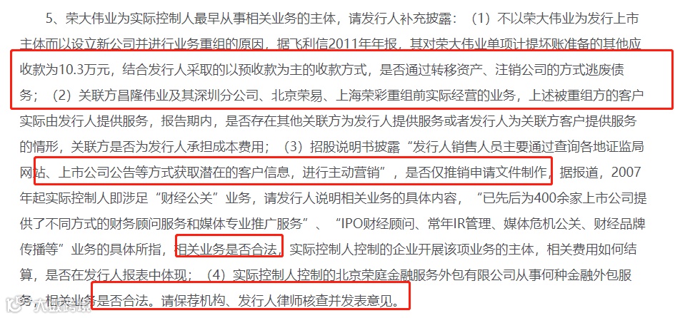 例如证监会的这个问题,质疑荣大财经公关、金融外包这些服务的合规性,言下之意就是“你自己看看你办的这事儿合法吗?”