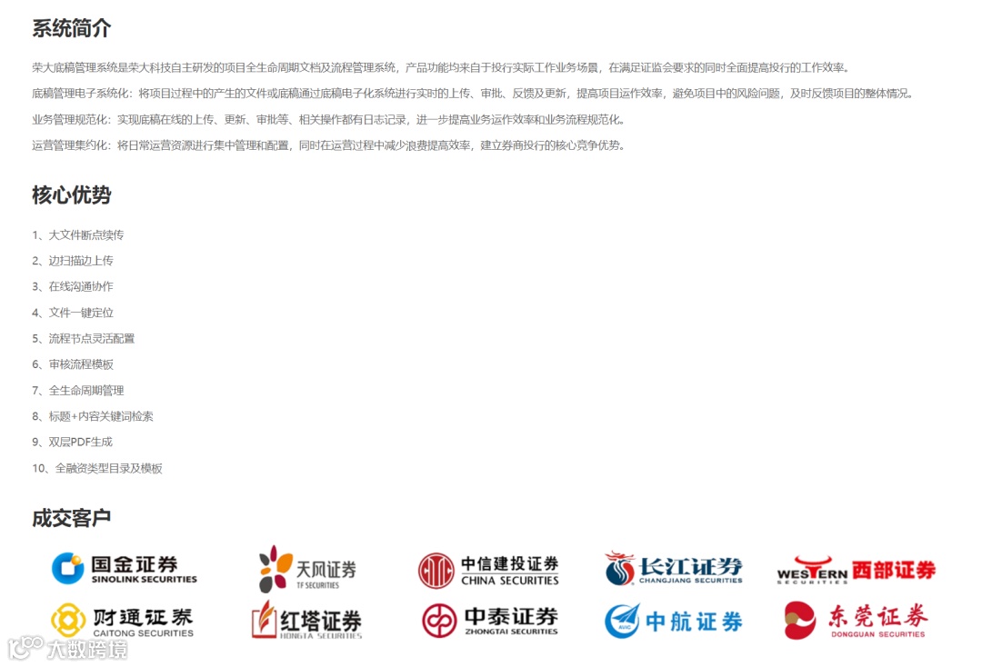 而且就算研究出来了,券商的投行人士多半也只能当作辅助,阿伟表示,荣大的工作底稿管理系统,虽然签约了很多券商客户,但或许它最大优势还是快速的扫描上传。
