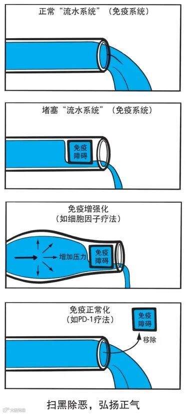 “免疫系统受到精细和微妙的调控,增强免疫力是一种危险的做法。我以水管为例做一个比喻。正常情况下的免疫反应,好比水流正常流通。一旦水管中间出现了阻断,水流就无法通过。阻断的地方好比是肿瘤发生的位置。解决的方法之一是增强水压,强行让水流通过(免疫增强化);还有一种方法是找到缺陷的部位,选择性地去除阻碍,让水流通过(免疫正常化)。抗 PD 疗法使用的就是后一种方法:找到肿瘤微环境中抑制免疫反应的通路,然后阻断这一通路,让免疫反应恢复正常。因此,我最近提出了免疫正常化的概念,将恶化的肿瘤微环境调整为正常状态,从而治疗癌症。”