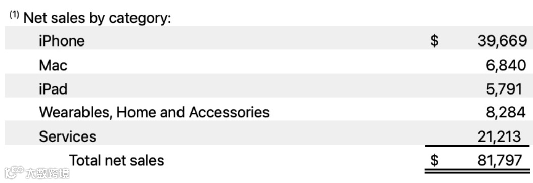 报告期内,Mac实现营收68.4亿美元,同比下降7.34%。此外,iPad收入同比下降19.83%至57.91亿美元;可穿戴设备、家居和配件收入同比增长2.47%至82.84亿美元.