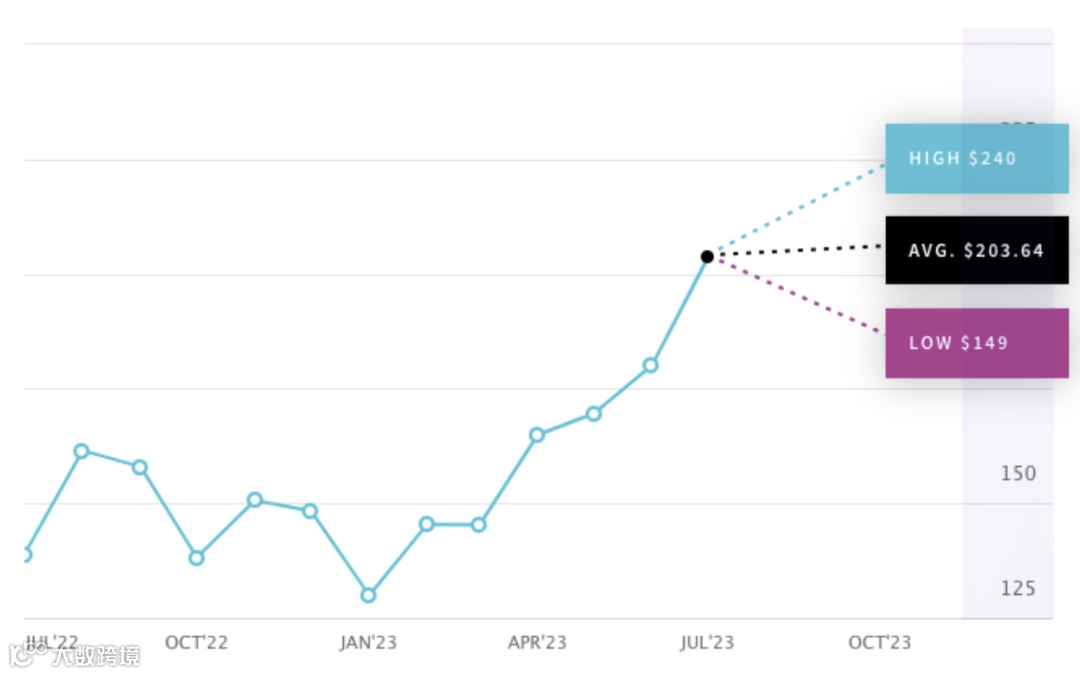 在三季报发布之前,Baird分析师威廉·鲍威尔(William Power)给予苹果“跑赢大盘”的评级,同时将目标价从180美元上调至204美元。他认为,财报发布后,人们的注意力会立刻转移到iPhone 15的发布和该公司下一个智能手机的周期上,并指出从历史上看,苹果股价在每年8月中旬到9月中旬期间的表现优于大盘。他说,由于苹果当前处于历史估值的高点,“任何回调”都会令他成为积极的买家。