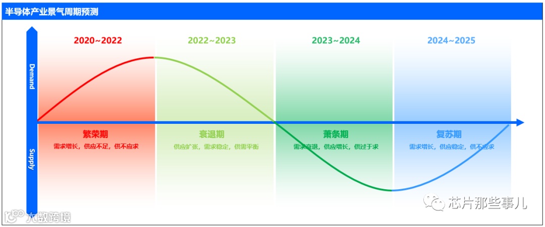 2012年,智能手机的快速普及,手机芯片的火热需求带来了半导体产业的繁荣。然而在半导体上游制造业大幅扩产后,芯片产能出现过程、半导体产业逐步衰退。到了2016年,伴随着4G技术的驱动,智能手机、智能手表等消费电子产品市场需求激增,芯片需求迎来旺盛增长,半导体产业再次走向繁荣。随着中美贸易战开启,这一轮繁荣周期戛然而止。再到后来,新冠疫情催生的市场繁荣不过短短两年时间,战争、通货膨胀带来的衰退就尾随而至。