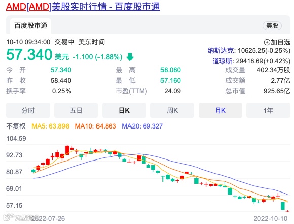 业绩警告发布后,AMD遭到了市场的凶猛抛售。10月7日美股开盘后,其股价一路走低,最终收盘大跌超13.8%,跌至58.44美元/股,单日蒸发市值超151.8亿美元(约合人民币1080亿元),2022年年内累计跌幅已接近60%,总市值跌至约943.4亿美元(约合人民币6700亿元)。