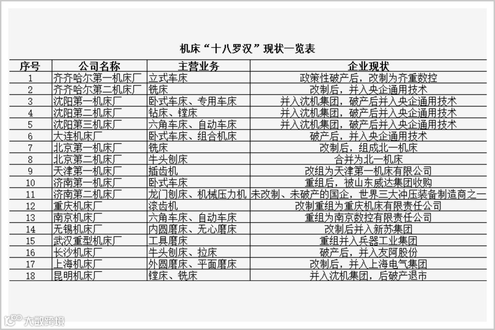 “十八罗汉”,一度代表着中国机床行业技术和规模的最高水平。新中国第一台车床(沈一机)、第一台卧式铣镗床(沈二机)、第一台数控龙门铣(齐二机)、第一台三座标数控龙门移动式铣床(北一机)……全都是“十八罗汉”们的杰作。