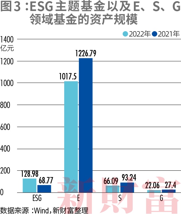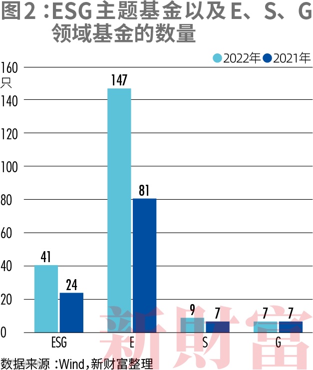 可见,163只子领域基金中,90.18%为E主题基金,占比超过九成。2022年新增的68只子领域基金中,66只为E主题,2只为S主题(图2)。