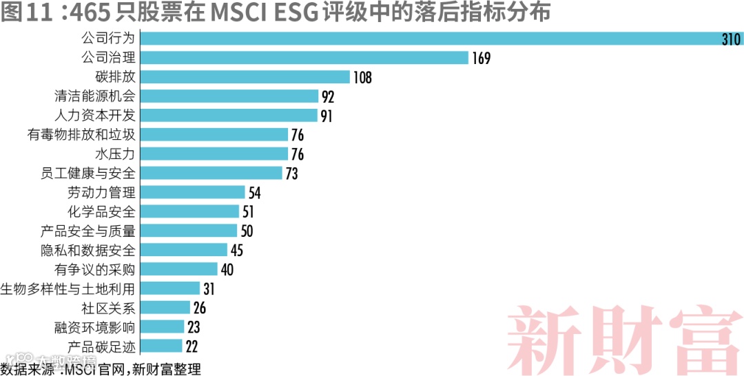 进一步分析465只股票在MSCI评级中的领先和落后指标,可见只有15家公司没有落后指标,而没有领先指标的公司高达259家,这意味着,超过半数的公司在MSCI评价的接近1万家公司中没有任何领先表现。