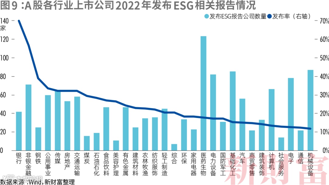 根据申万行业分类,发布率最高的是银行业,达到100%,42家银行业上市公司全部发布ESG相关报告,非银金融行业发布率超过了80%,由此或可理解针对A股市场的境外ESG指数的权重股为何以金融公司为主。钢铁行业发布率超过了50%,公用事业、传媒、房地产、交通运输、煤炭、石油石化这6个行业的发布率也超过了40%(图9)。