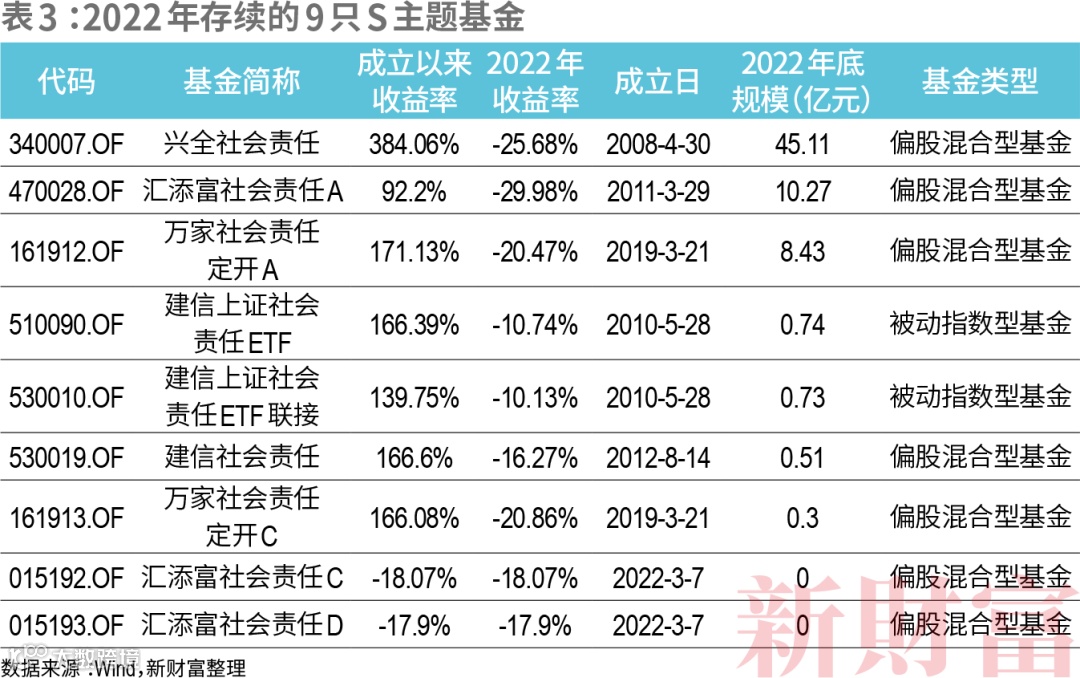 截至2022年底,S主题基金规模为66.09亿元,较2021年末缩水29.11%,仅为E主题基金的6.5%,并且67.43%的资金集中于兴全社会责任这一只基金,汇添富社会责任A、万家社会责任定开A基金规模则分别为10.27亿元和8.43亿元,其余6只基金规模均不到1亿元。