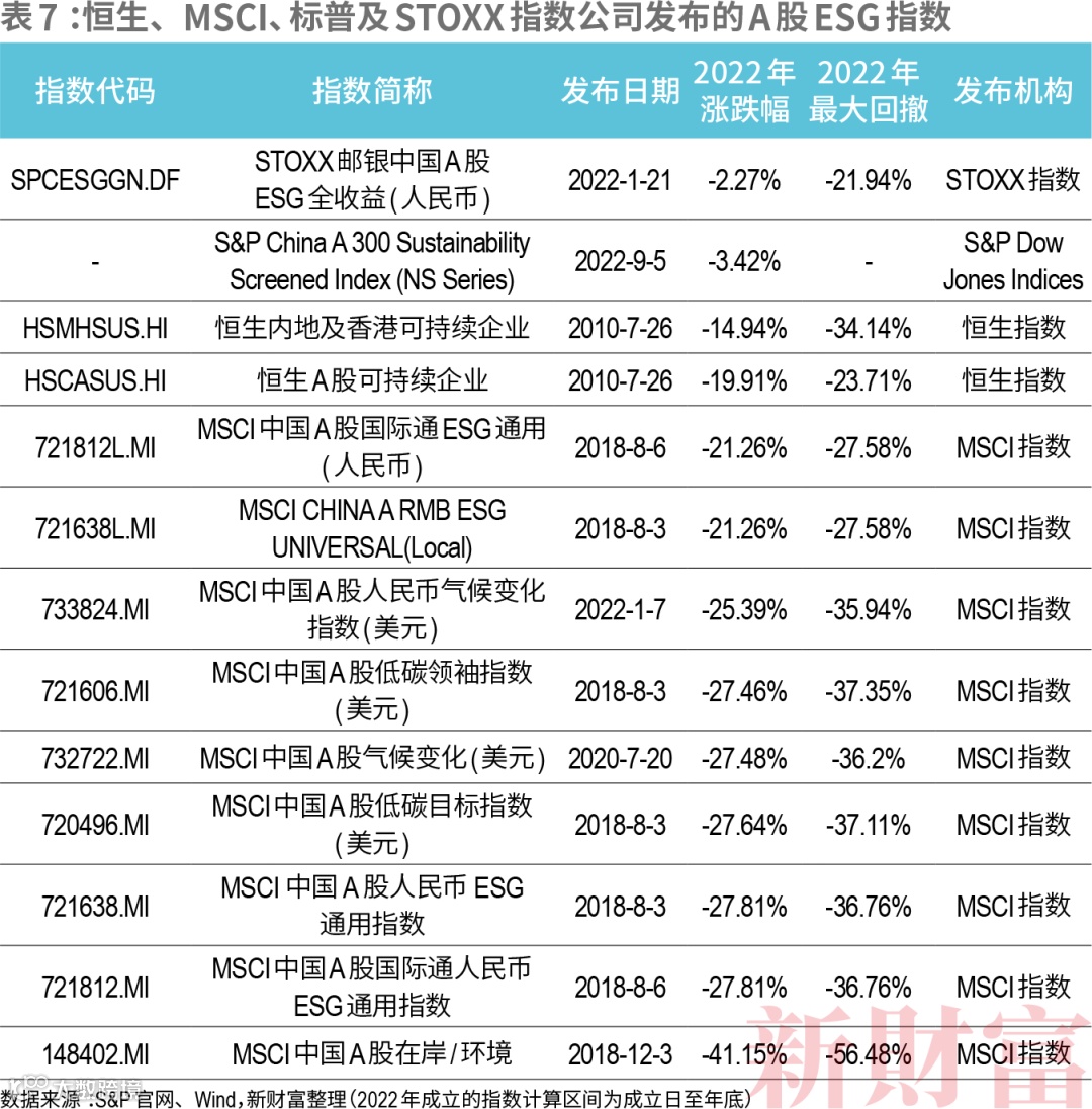 境外指数公司中,恒生指数公司最早发布针对A股市场的ESG股票指数。2010年7月,恒生同时发布了恒生A股可持续企业、恒生内地及香港可持续企业指数。这两个ESG指数从上市首日至2022年底的收益率分别达到27.83%和84.28%,2022年的收益率分别高出沪深300指数6.69和1.72个百分点(表7)。