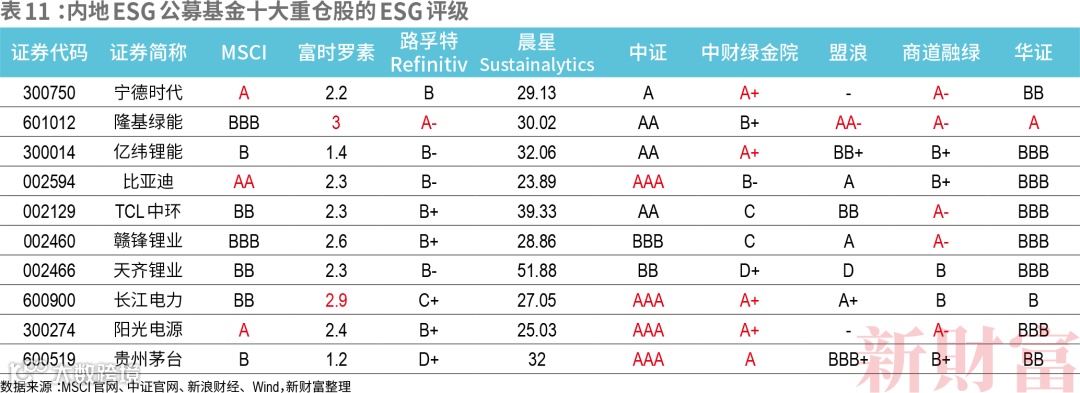 对照内地ESG公募基金十大重仓股来看,只有隆基绿能、阳光电源两家受到9家主流评级机构重视,其余8家公司获得的评价并不高。其中出入,也印证了ESG投资的标准有待统一(表11)。