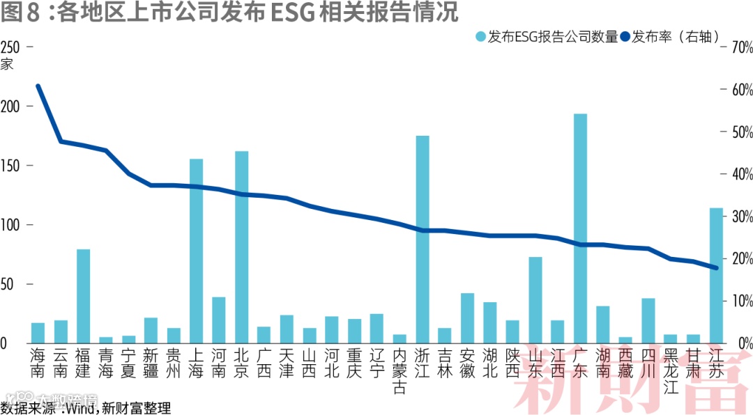 从上市公司总部所在地看,发布率最高的是海南,达60.71%,发布率超过40%的还有云南、福建、青海和宁夏,北京、上海、天津发布比例超过1/3,山东、广东发布比例接近1/4,最低的江苏,仅为17.87%(图8)。这一结果主要因云南、宁夏国企占比较高,海南、云南、青海、福建大型企业占比较高,青海占比更高达82%,北京、上海金融企业占比较高,这些企业发布ESG报告的意愿更强。江苏、广东、山东民营企业占比均超过70%,民企对于ESG的重视程度各异。