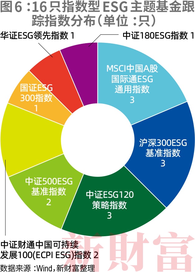 由于目前国内尚无一个ESG指数获得市场高度认可,16只指数型ESG主题基金跟踪的指数非常分散(图6)。其中,跟踪MSCI中国A股国际通ESG通用指数、沪深300 ESG指数、中证ESG 120策略指数的基金分别有3只,跟踪中证500 ESG指数以及中证财通中国可持续发展100指数的基金分别有2只,跟踪国证ESG指数、华证ESG领先指数以及中证180 ESG指数的基金均只有1只。