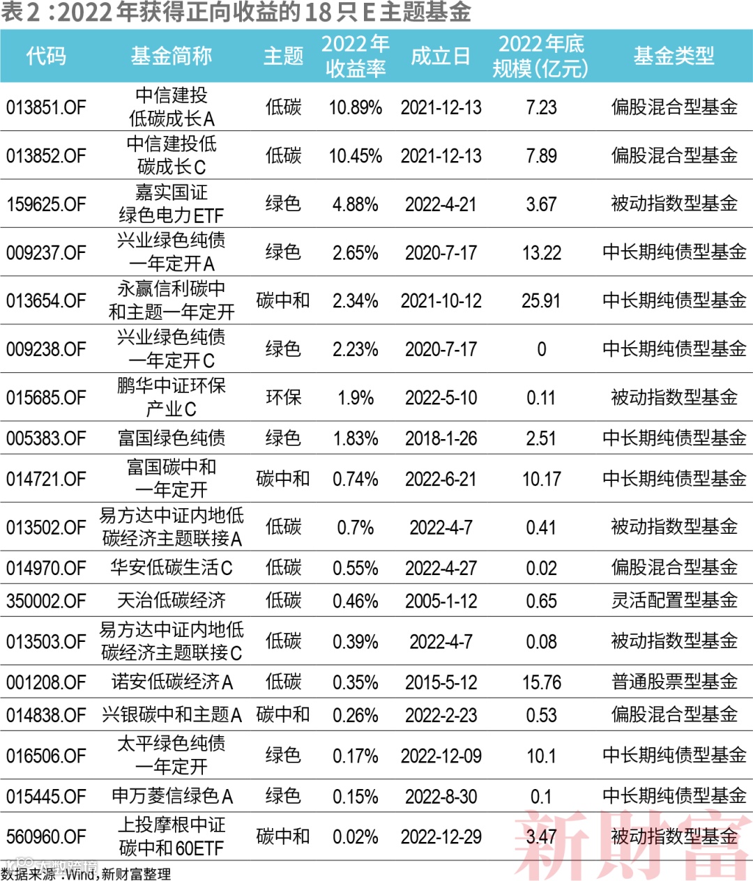 从2022年收益率看,18只E主题基金获得正向收益,占比不到1/7。收益率超过10%的仅有2只,分别为中信建投低碳成长A类和C类份额,收益率分别为10.88%和10.36%(表2)。该基金成立于2021年12月,为偏股混合型基金,投资风格以大盘成长股和小盘成长股为主,2022中报业绩归因结果显示其在电力设备、家用电器行业分别获得28.22%和2.98%的超额收益,三季报收益率贡献主要来自德业股份(605117)、晶科能源(688223)、派能科技(688063)等重仓标的。