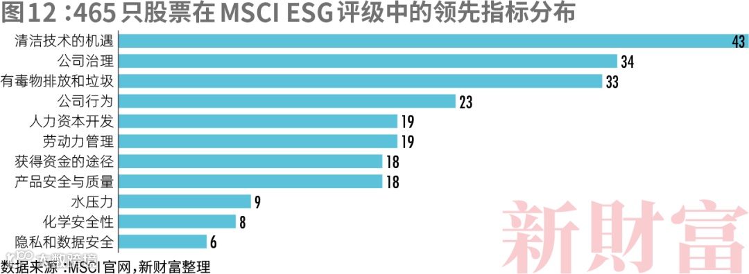 从领先方面看,465只股票共性不高,其中,分别有43家、34家和33家在清洁技术的机遇、公司治理、有毒物排放和垃圾这3个指标上处在行业领先水平(图12)。