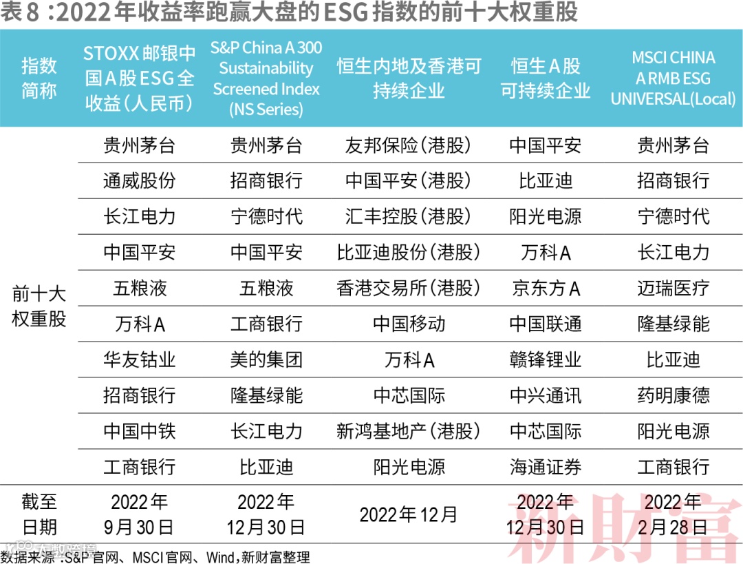 德意志交易所旗下的斯托克(STOXX)指数公司于2022年1月与中国机构共同发布了STOXX邮银中国A股ESG全收益(人民币),在非内地指数公司发布的A股ESG指数中,其2022年收益率跌幅最小,跑赢大盘19.36个百分点。其成分股筛选自STOXX中国A股900指数内自由流通市值最大的300只证券,并运用负面筛选策略,剔除被中财绿金院评估为不符合联合国全球契约原则的公司,或涉及有争议武器、烟草或热能煤的企业。其成分股集中在食品、饮料和烟草业以及银行业,占比分别为18.5%和16%,排在第三位的科技行业占比为8%。